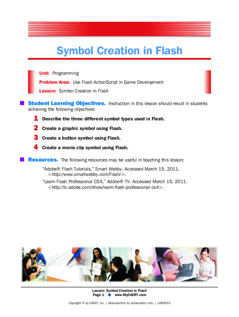 Symbol Creation in Flash Unit: Programming Problem Area: Use Flash ActionScript in Game Development Lesson: Symbol Creation in Flash Student Learning Objectives. Instruction in this lesson should