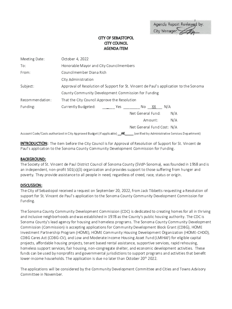 This document outlines the agenda item for the City Council meeting held on October 4, 2022, related to the approval of a resolution supporting St. Vincent de Paul\'s application for funding from the Sonoma County Community Development Commission. The resolution is aimed at aiding the organization in creating affordable housing options for low-income and extremely low-income residents in Sebastopol.