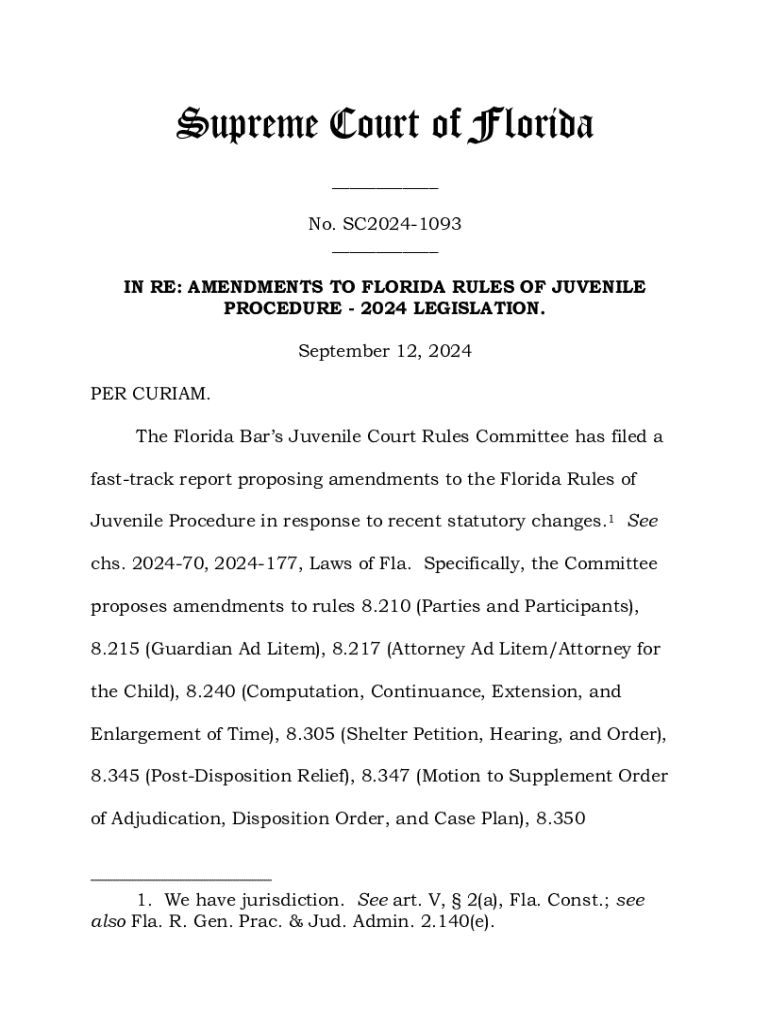Supreme Court of Florida ___ No. SC20241093 ___ IN RE: AMENDMENTS TO FLORIDA RULES OF JUVENILE PROCEDURE 2024 LEGISLATION. September 12, 2024 PER CURIAM. The Florida Bars Juvenile Court Rules Committee