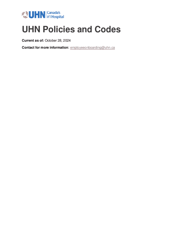 UHN Policies and Codes Current as of: October 28, 2024 Contact for more information: employeeonboarding@uhn.caContext and Instructions This booklet includes UHN Policies and Codes that need to be