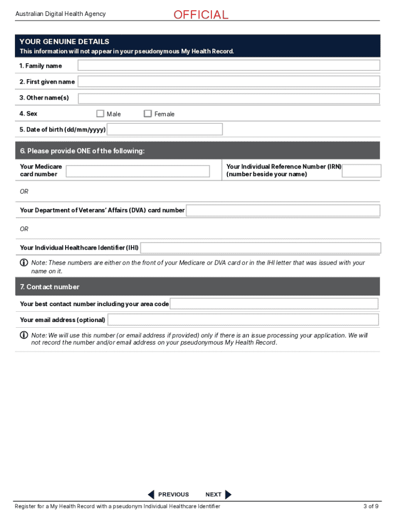 Register for a My Health Record with a pseudonym Individual Healthcare Identifier PURPOSE OF THIS FORM Use this form to apply to the Australian Digital Health Agency (the System Operator under the