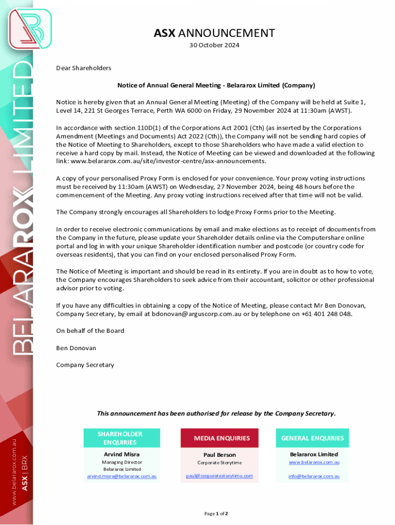 ASX ANNOUNCEMENT 30 October 2024 Dear Shareholders Notice of Annual General Meeting Belararox Limited (Company) Notice is hereby given that an Annual General Meeting (Meeting) of the Company will