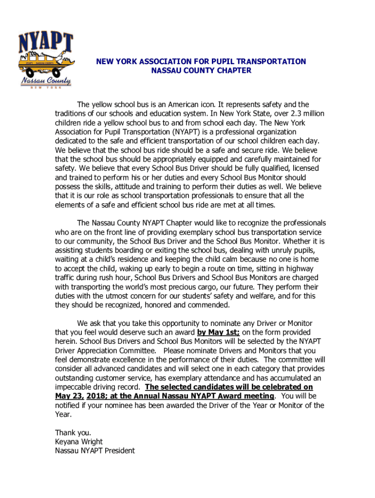 This document outlines the nomination process for the Driver of the Year and Bus Monitor of the Year awards established by the Nassau County Chapter of the New York Association for Pupil Transportation (NYAPT). It emphasizes the importance of school bus drivers and monitors in ensuring the safety and welfare of students and provides guidance on submitting nominations for candidates who exhibit exceptional service and dedication.