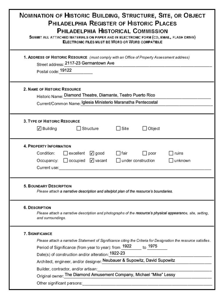This document serves as a formal nomination for The Diamond Theatre, located at 2117-23 Germantown Avenue in Philadelphia, to be included in the Philadelphia Register of Historic Places. It details the historic significance of the theatre, its architectural features, and its cultural impact on the local community, particularly during its years of operation as a Spanish-language theatre serving the Puerto Rican population.