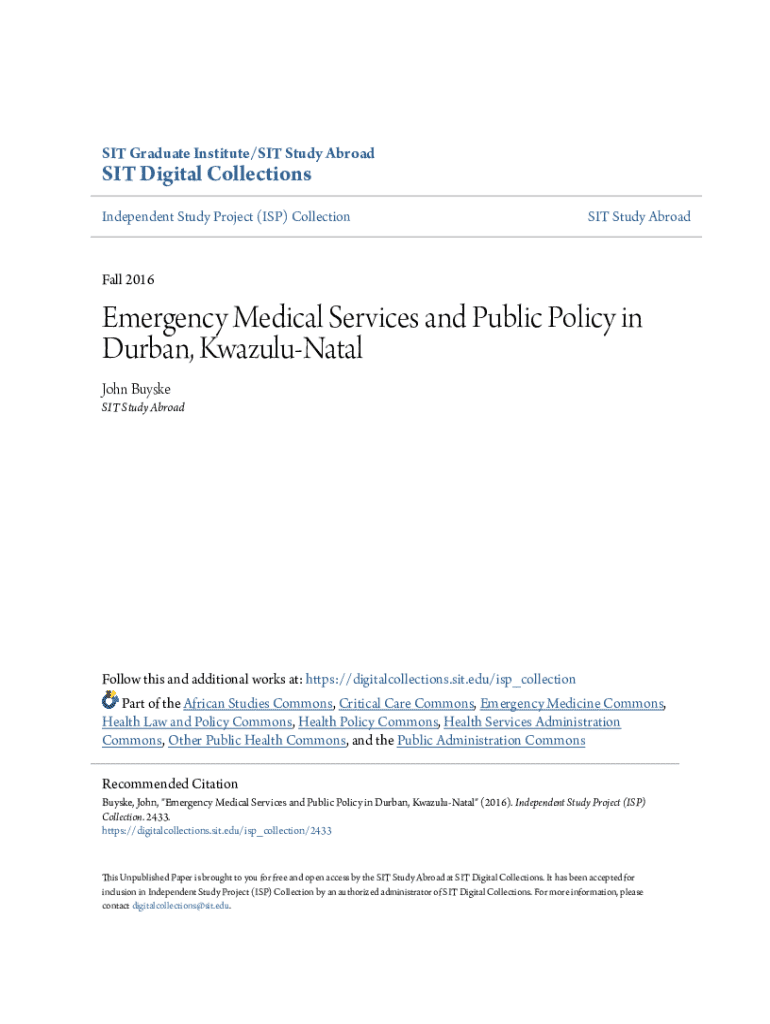 Get the free Emergency Medical Services and Public Policy in Durban, Kwazulu-Natal - digitalcolle...