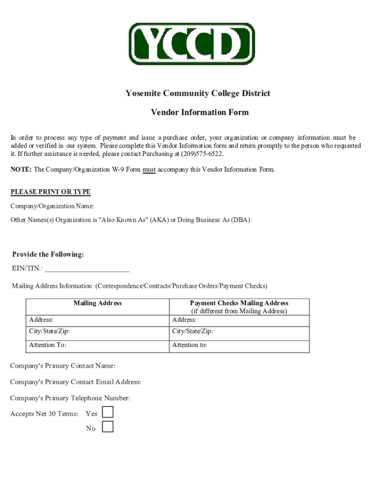 This Vendor Information Form is required for organizations to ensure their details are accurately recorded in the Yosemite Community College District system for payment processing and purchase order issuance. It also necessitates the inclusion of the W-9 Form for tax purposes.
