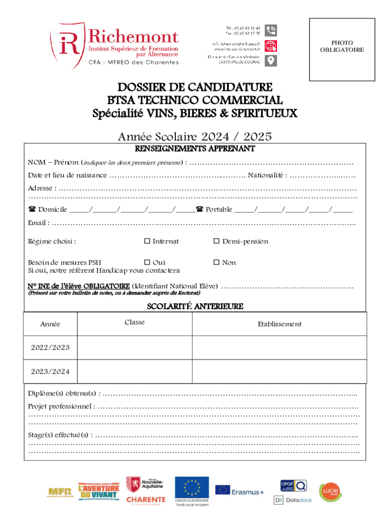 PHOTO OBLIGATOIREDOSSIER DE CANDIDATURE BTSA TECHNICO COMMERCIAL Spcialit VINS, BIERES & SPIRITUEUX Anne Scolaire 2024 / 2025 RENSEIGNEMENTS APPRENANT NOM Prnom (indiquer les deux premiers prnoms)