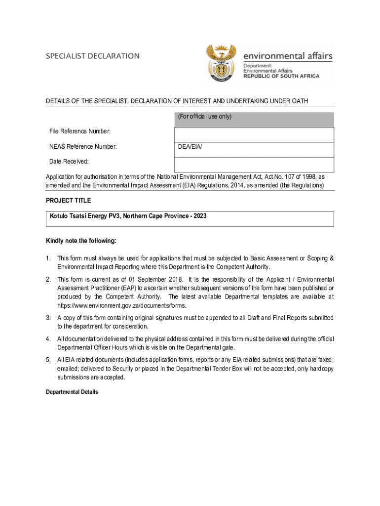 SPECIALIST DECLARATIONDETAILS OF THE SPECIALIST, DECLARATION OF INTEREST AND UNDERTAKING UNDER OATH (For official use only) File Reference Number: NEAS Reference Number:DEA/EIA/Date Received: Application