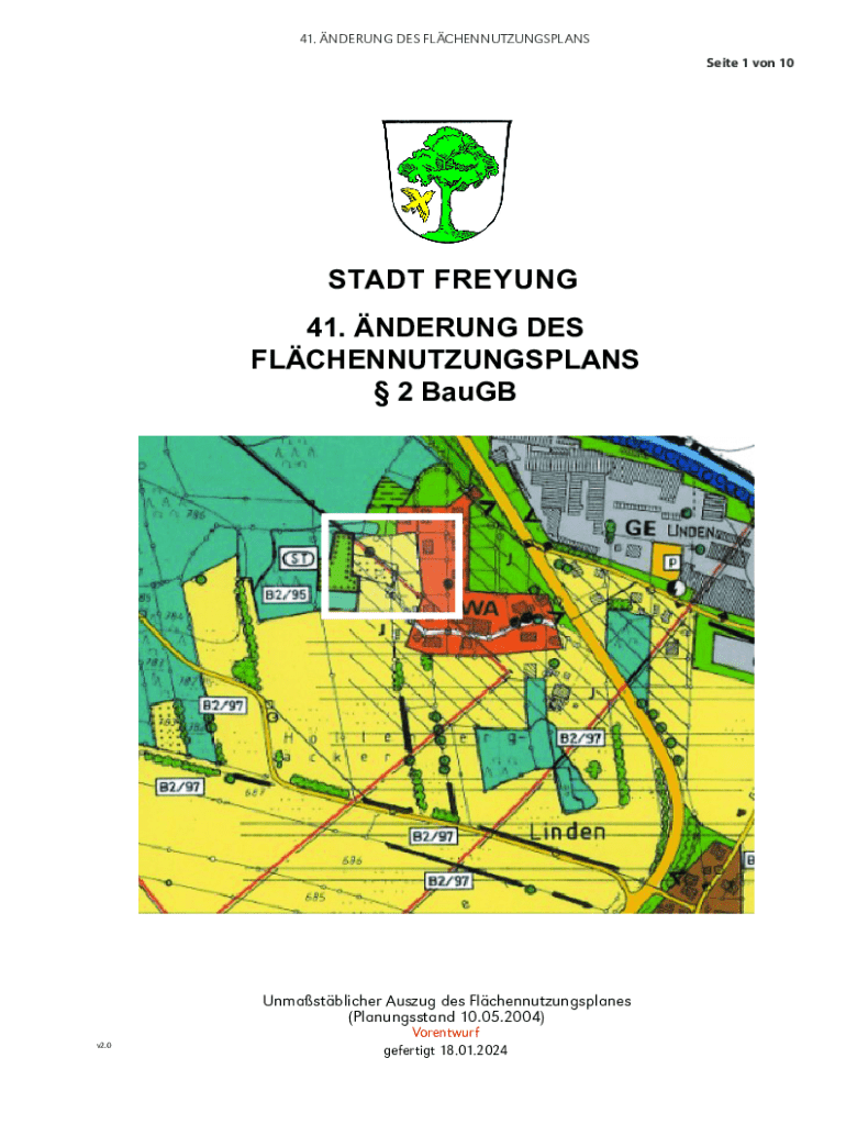 41. NDERUNG DES FLCHENNUTZUNGSPLANS Seite 1 von 10STADT FREYUNG 41. NDERUNG DES FLCHENNUTZUNGSPLANS 2 BauGBUnmastblicher Auszug des Flchennutzungsplanes (Planungsstand 10.05.2004) v2.0Vorentwurf gefertigt