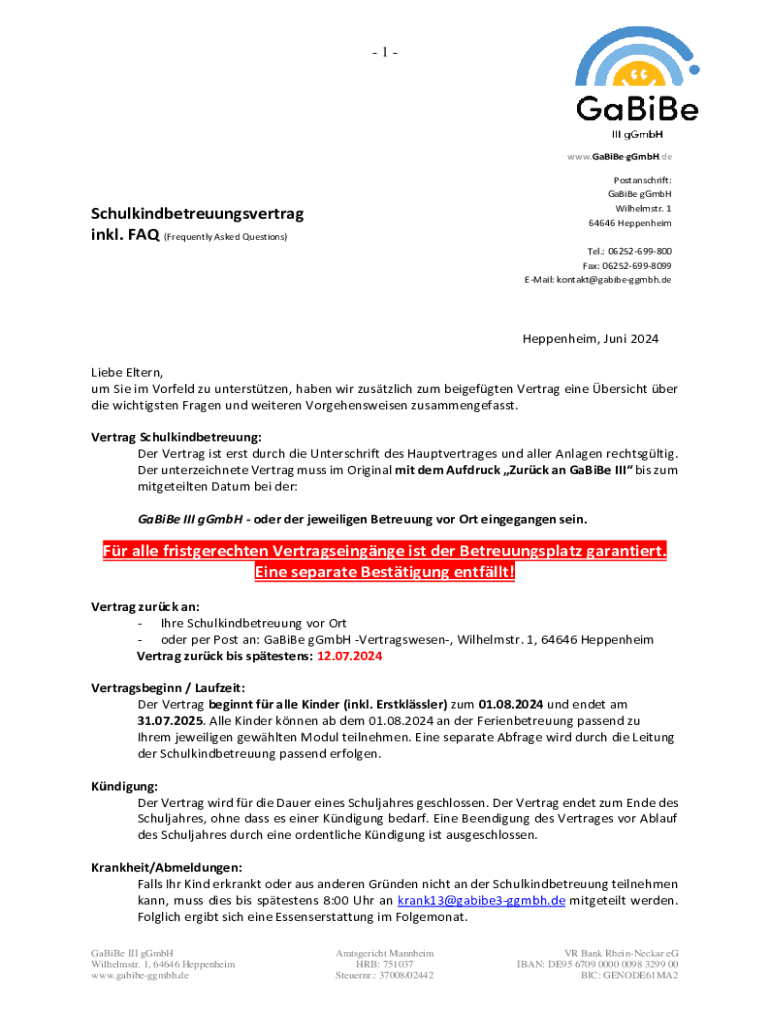 1www.GaBiBegGmbH.de Postanschrift: GaBiBe gGmbH Wilhelmstr. 1 64646 HeppenheimSchulkindbetreuungsvertrag inkl. FAQ (Frequently Asked Questions)Tel.: 06252699800 Fax: 062526998099 EMail: kontakt@gabibeggmbh.deHeppenheim,