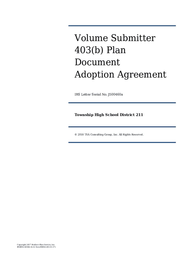 Volume Submitter 403(b) Plan Document Adoption Agreement IRS Letter Serial No. J500460aTownship High School District 211 2018 TSA Consulting Group, Inc. All Rights Reserved.Copyright 2017 PenServ