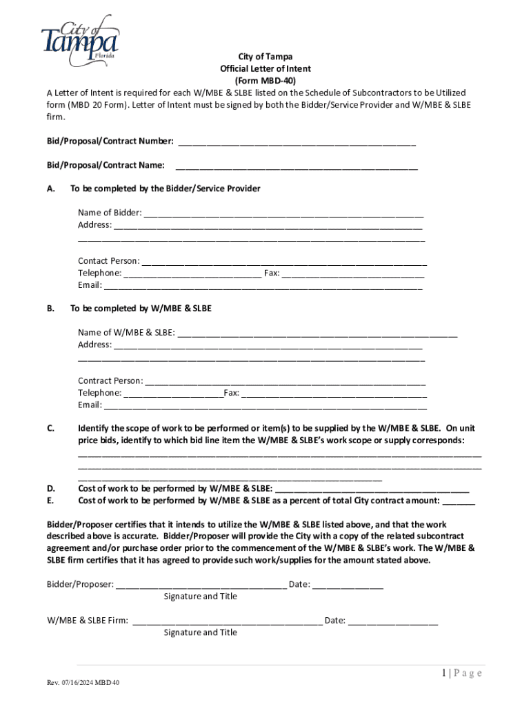 This document is an Official Letter of Intent required by the City of Tampa for each W/MBE (Women/Minority Business Enterprise) and SLBE (Small Local Business Enterprise) listed on the Schedule of Subcontractors to be utilized. It includes sections for the Bidder/Service Provider and the W/MBE & SLBE to fill out detailed company information, the scope of work, cost estimation, and signatures to confirm the intent to utilize the listed subcontractors.
