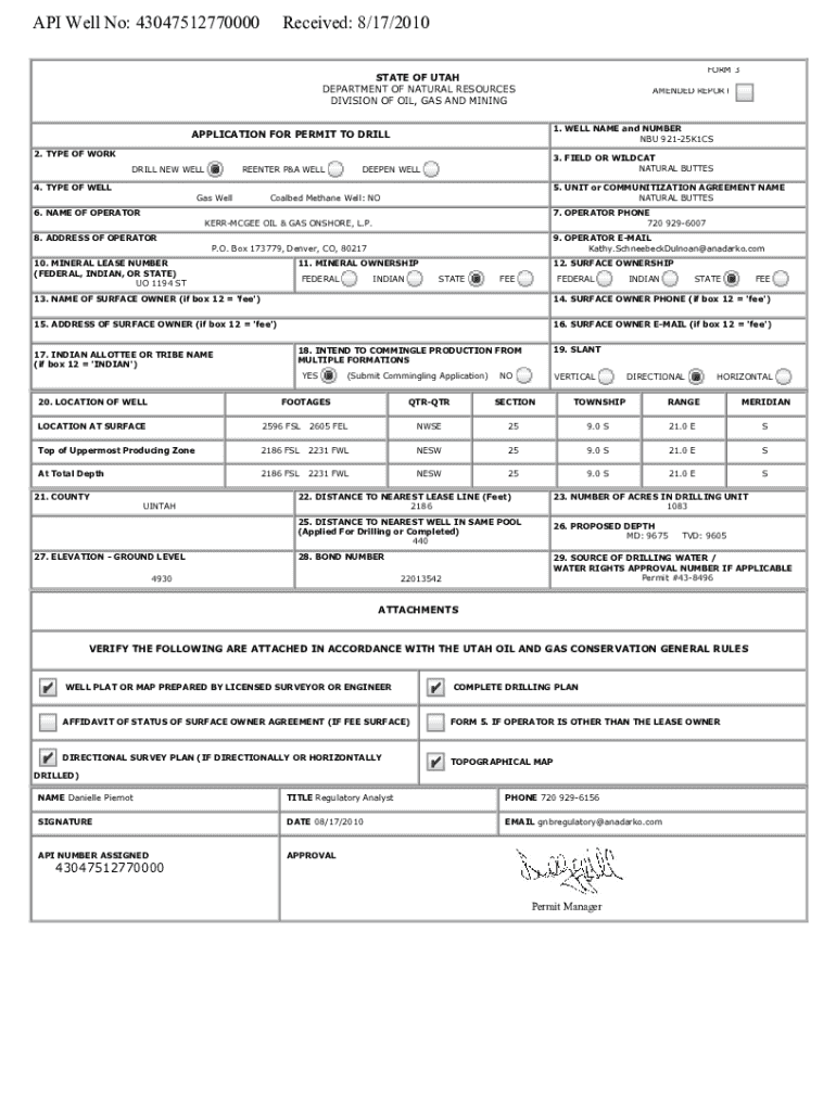 API API Well API Well No: No: 43047512770000 43047512770000Received: Received: Received: 8/17/2010 8/17/2010 EORM 3 FORM FORM 3STATE OF OF UTAH UTAH STATE DEPARTMENT DEPARTMENT OF NATURAL NATURAL RESOURCES RESOURCES DIVISION OF OIL, GAS AND MINING MINING DIVISION OIL, GASAMENDED REPORT REPORT1. WELL WELL NAME NAME and and NNUUM9B2E1R25K1CS 1. NUMBER andNNUM9B2E1R25K1CS NBU 92125K1CSAPPLICATION FOR PERMIT PERMIT TO TO DRILL DRILL APPLICATION FOR 2. TYPE OF WORK WORK 2. TYPE OF DRILL DRILL NEW...