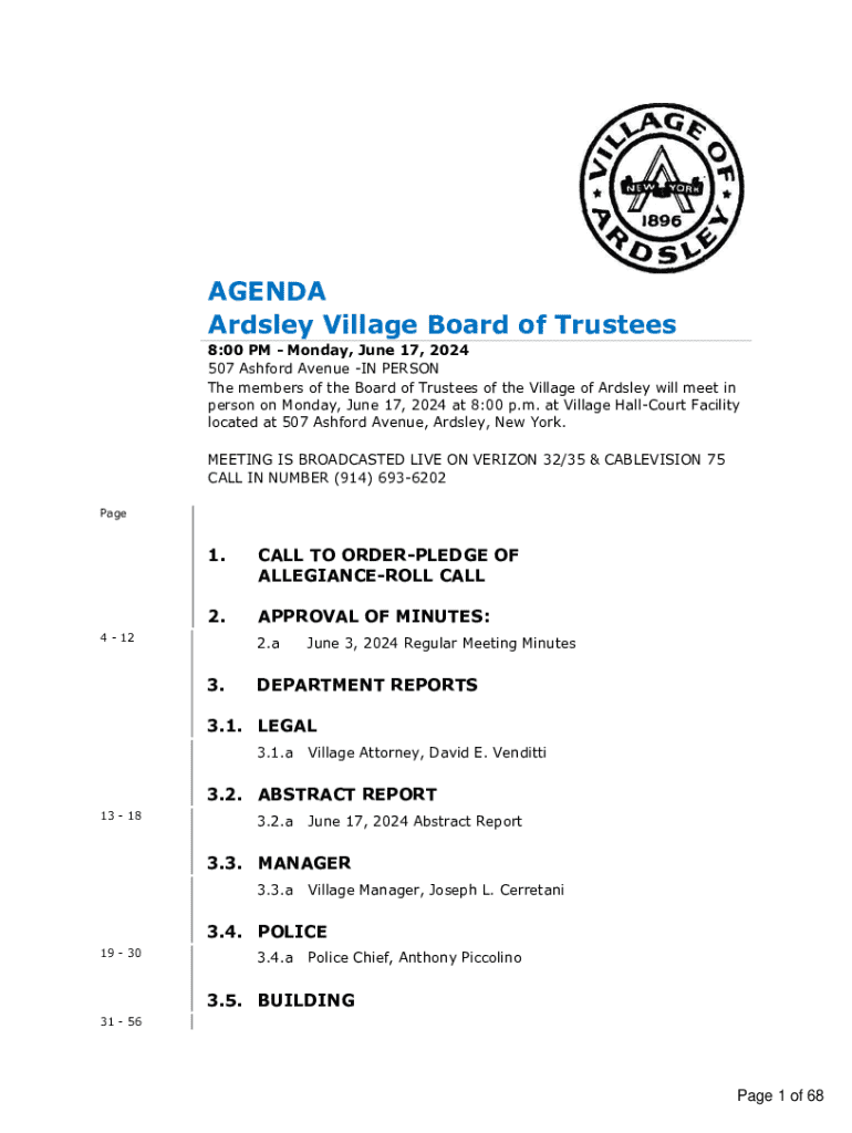 AGENDA Ardsley Village Board of Trustees 8:00 PM Monday, June 17, 2024 507 Ashford Avenue IN PERSON The members of the Board of Trustees of the Village of Ardsley will meet in person on Monday, June