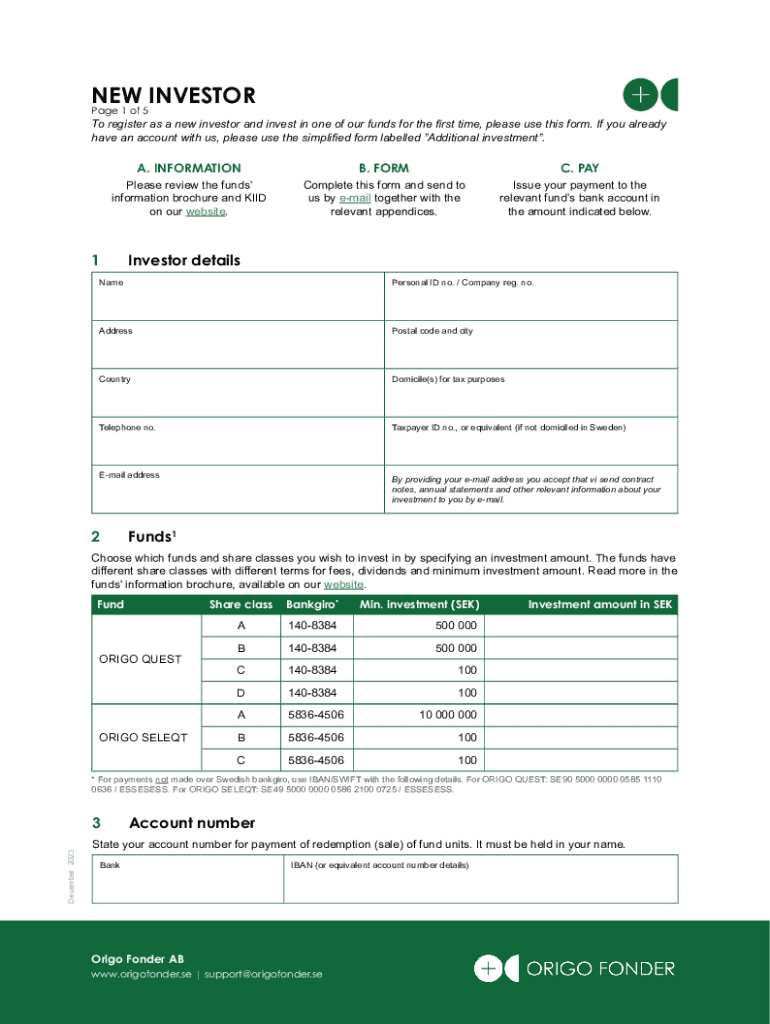 This form is intended for new investors looking to register and invest in the funds offered by Origo Fonder AB. It includes sections for investor information, fund selection, payment instructions, and compliance with know your customer (KYC) regulations.