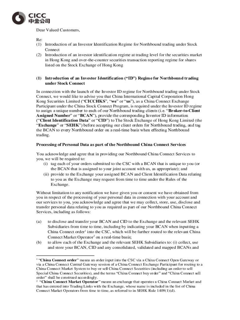 Dear Valued Customers, Re: (1) Introduction of an Investor Identification Regime for Northbound trading under Stock Connect (2) Introduction of an investor identification regime at trading level for