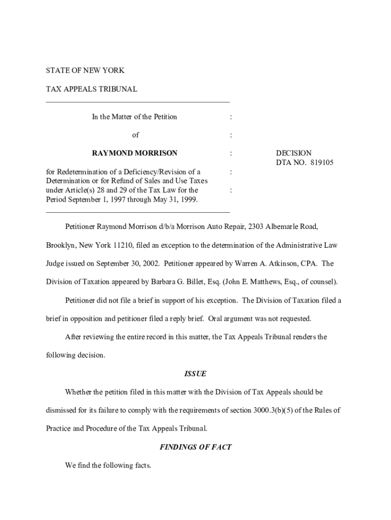 This document is a decision from the New York State Tax Appeals Tribunal regarding a petition filed by Raymond Morrison for the redetermination of sales and use tax liabilities covering the period from September 1, 1997, to May 31, 1999. The decision reviews the procedural deficiencies in Morrison\'s petition and outlines the legal requirements for submitting a petition to the Division of Tax Appeals. The Tribunal orders a remand of the case back to the Division of Tax Appeals for further...