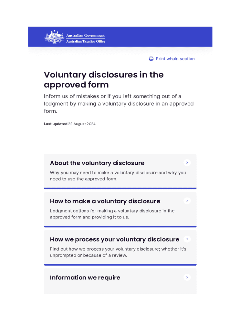 Print whole sectionVoluntary disclosures in the approved form Inform us of mistakes or if you left something out of a lodgment by making a voluntary disclosure in an approved form. Last updated 22