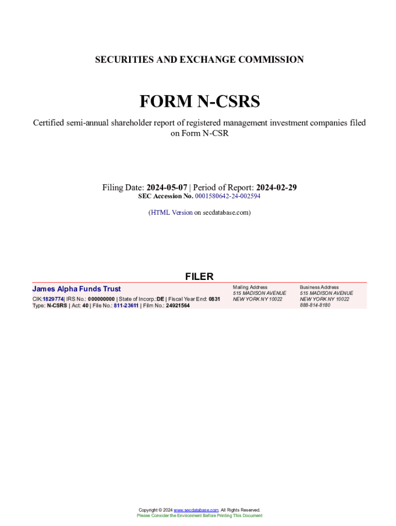 This document serves as a certified semi-annual shareholder report for registered management investment companies, detailing the performance and financial information of the funds managed by the James Alpha Funds Trust as of February 29, 2024.