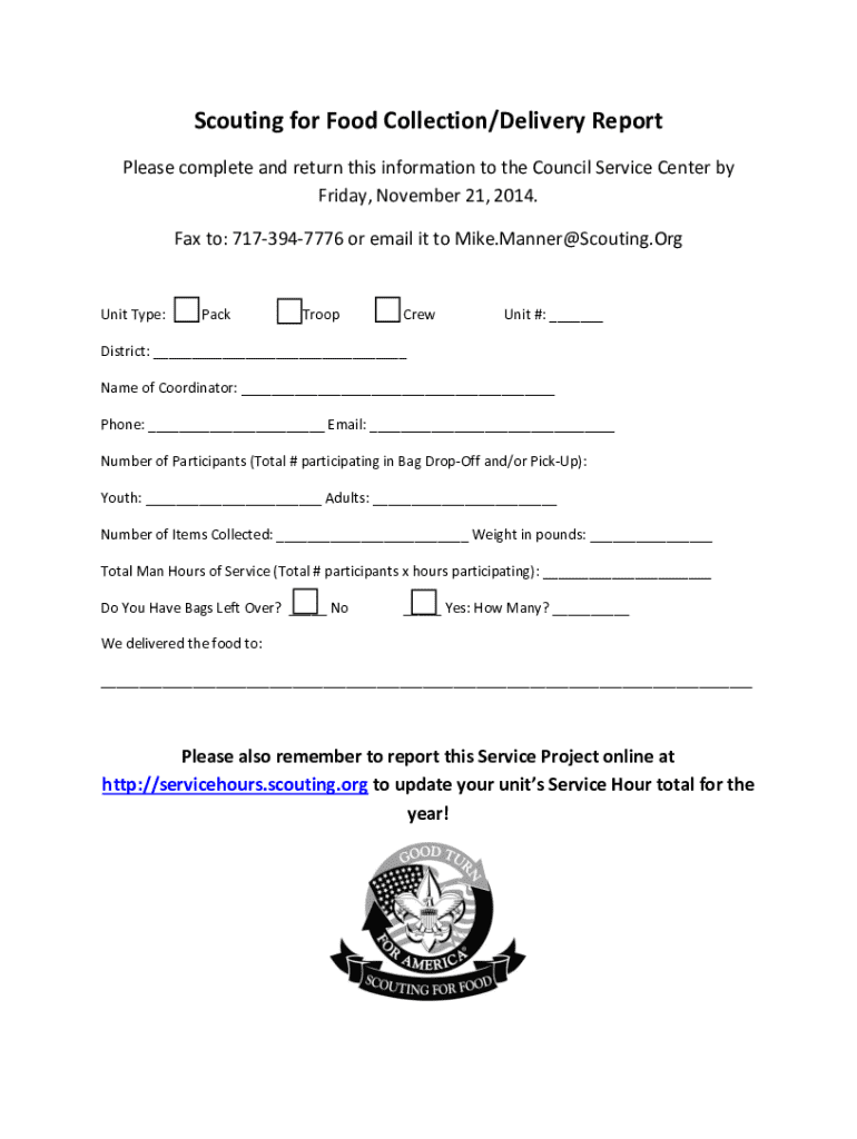 Scouting for Food Collection/Delivery Report Please complete and return this information to the Council Service Center by Friday, November 21, 2014. Fax to: 7173947776 or email it to Mike.Manner@Scouting.OrgUnit