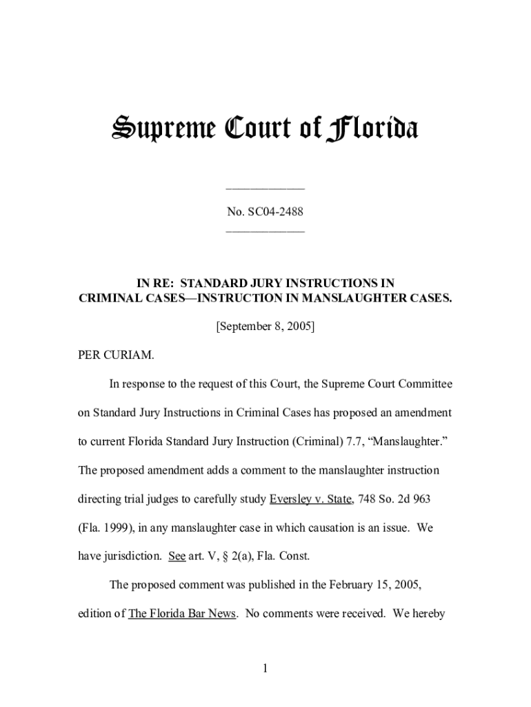 This document addresses the proposed amendment to the Florida Standard Jury Instruction relating to Manslaughter, highlighting the importance of the Eversley v. State case in determining causation in manslaughter cases. It outlines the elements required to prove manslaughter and clarifies the definitions of culpable negligence and justifiable homicide.