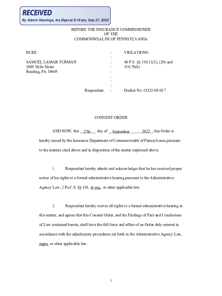 By Admin Hearings, Ins Dept at 8:19 am, Sep 27, 2022BEFORE THE INSURANCE COMMISSIONER OF THE COMMONWEALTH OF PENNSYLVANIA IN RE: SAMUEL LAMAR TURMAN 1005 Shilo Street Reading, PA 19605Respondent.: