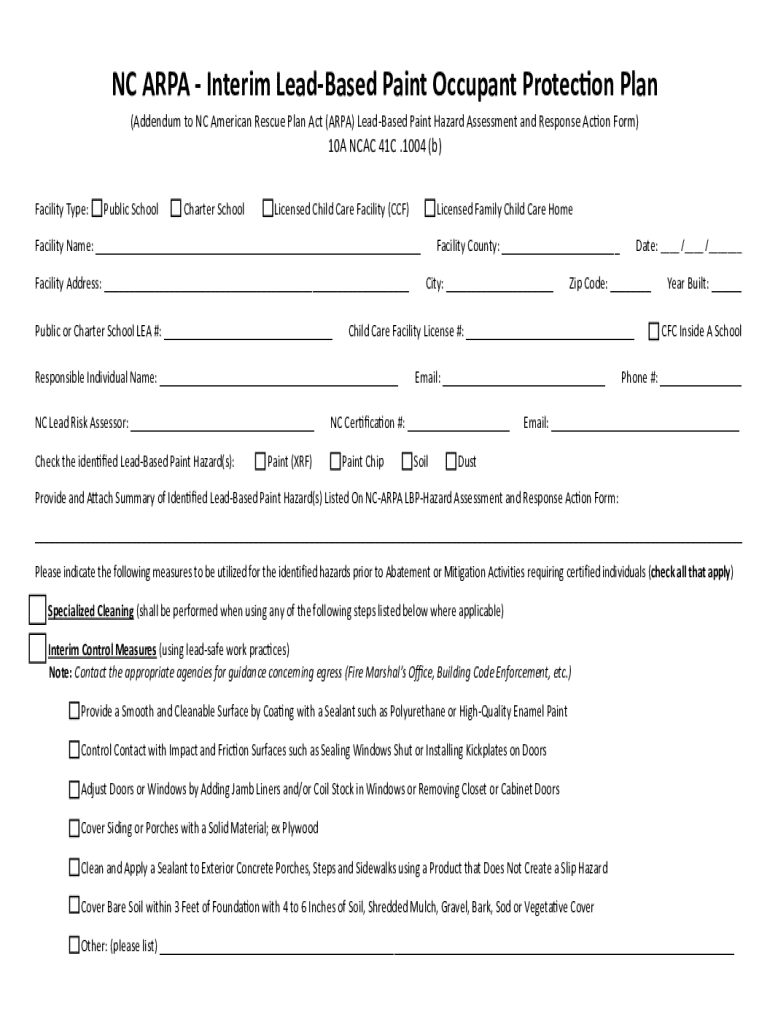 NC ARPA Interim LeadBased Paint Occupant Protection Plan (Addendum to NC American Rescue Plan Act (ARPA) LeadBased Paint Hazard Assessment and Response Action Form)10A NCAC 41C .1004 (b) Facility