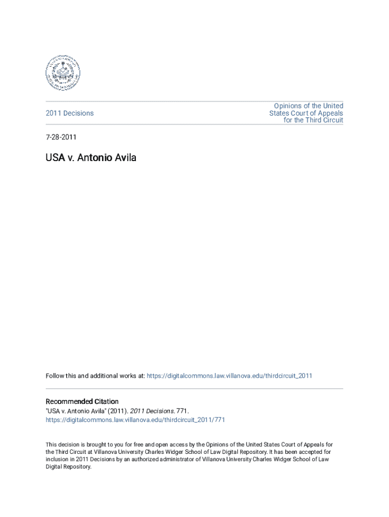 2011 DecisionsOpinions of the United States Court of Appeals for the Third Circuit7282011USA v. Antonio AvilaFollow this and additional works at: https://digitalcommons.law.villanova.edu/thirdcircuit_2011Recommended