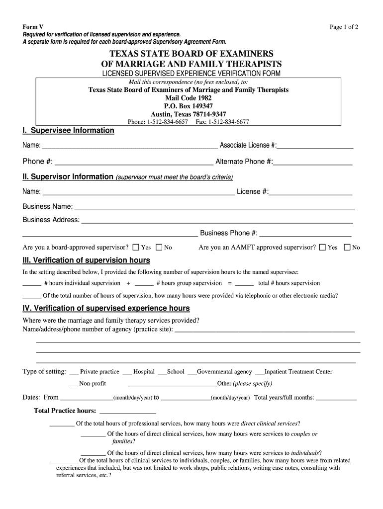 Form V Required for verification of licensed supervision and experience. A separate form is required for each board-approved Supervisory Agreement Form. Page 1 of 2 TEXAS STATE BOARD OF EXAMINERS
