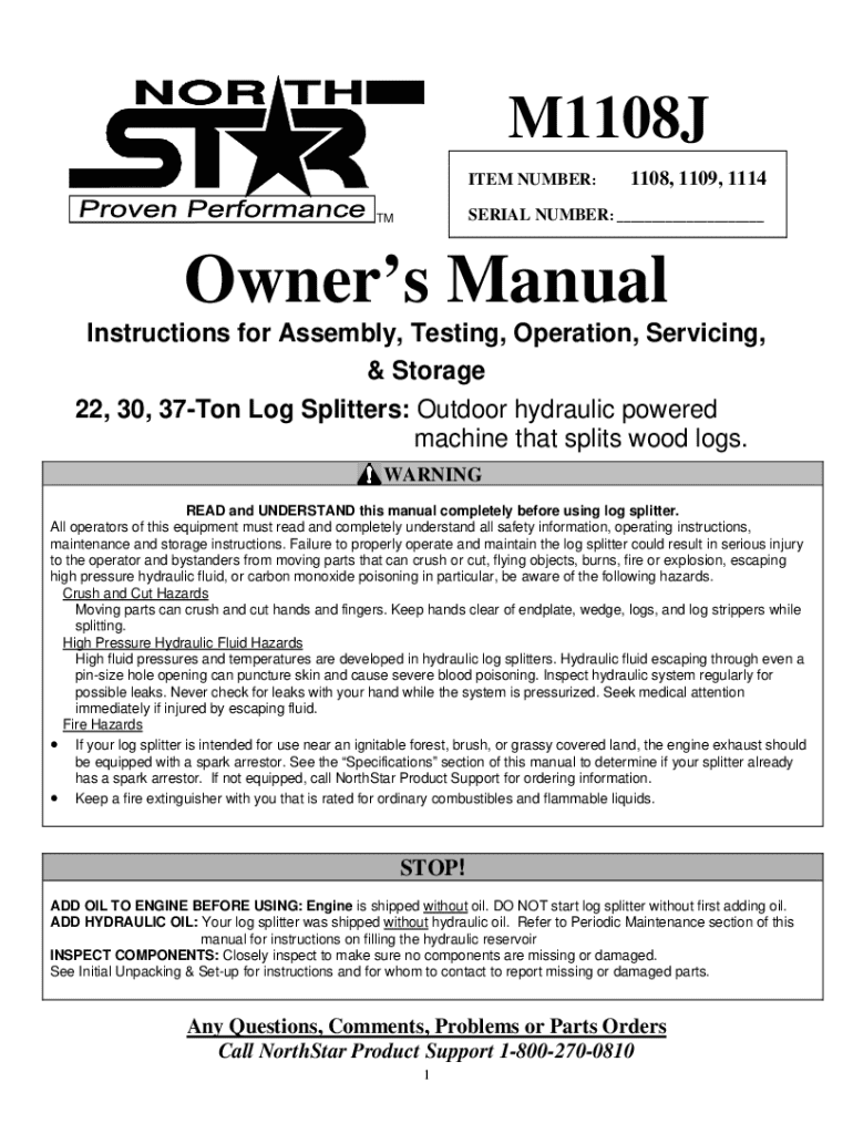M1108J ITEM NUMBER:1108, 1109, 1114SERIAL NUMBER: ___TMOwners Manual Instructions for Assembly, Testing, Operation, Servicing, & Storage 22, 30, 37Ton Log Splitters: Outdoor hydraulic powered machine