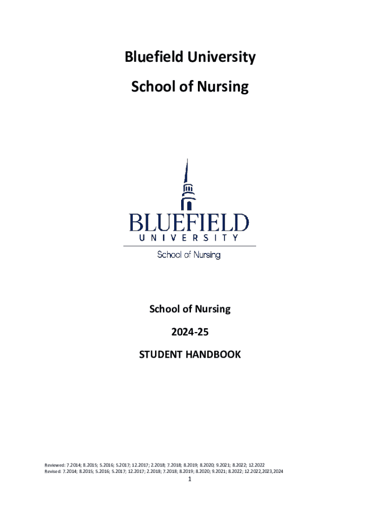 Bluefield University School of NursingSchool of Nursing 202425 STUDENT HANDBOOKReviewed: 7.2014; 8.2015; 5.2016; 5.2017; 12.2017; 2.2018; 7.2018; 8.2019; 8.2020; 9.2021; 8.2022; 12.2022 Revised: 7.2014;