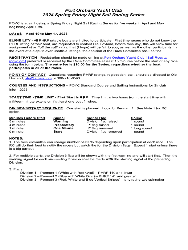 Port Orchard Yacht Club 2024 Spring Friday Night Sail Racing Series POYC is again hosting a Spring Friday Night Sail Racing Series for five weeks in April and May beginning April 19th. DATES April