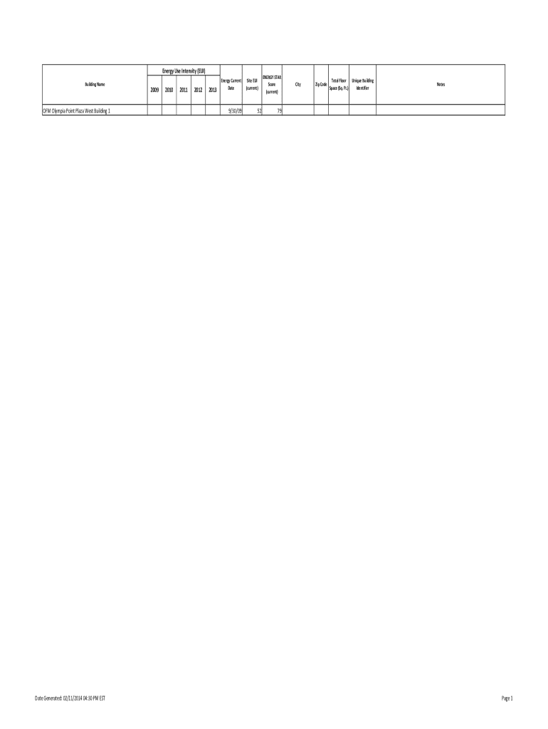 Energy Use Intensity (EUI) Building NameOFM Olympia Point Plaza West Building 1Date Generated: 02/11/2014 04:30 PM EST20092010201120122013Energy Current Date9/30/09Site EUI (current)52ENERGY STAR