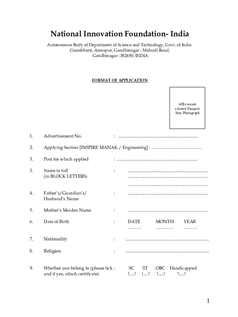 National Innovation Foundation India Autonomous Body of Department of Science and Technology, Govt. of India Grambharti, Amrapur, Gandhinagar Mahudi Road, Gandhinagar 382650, INDIAFORMAT OF APPLICATIONAffix