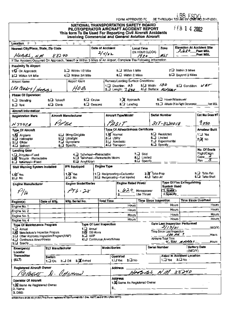 LBB J:.n dtMQ, 31470001FORM APPROVED FC.SE THROUGH 7131/96 BYNATIONAL TRANSPORTATION SAFETY BOARD PILOT/OPERATOR AIRCRAFT ACCIDENT REPORT This form To Be Used For Reporting Civil Aircraft Accidents