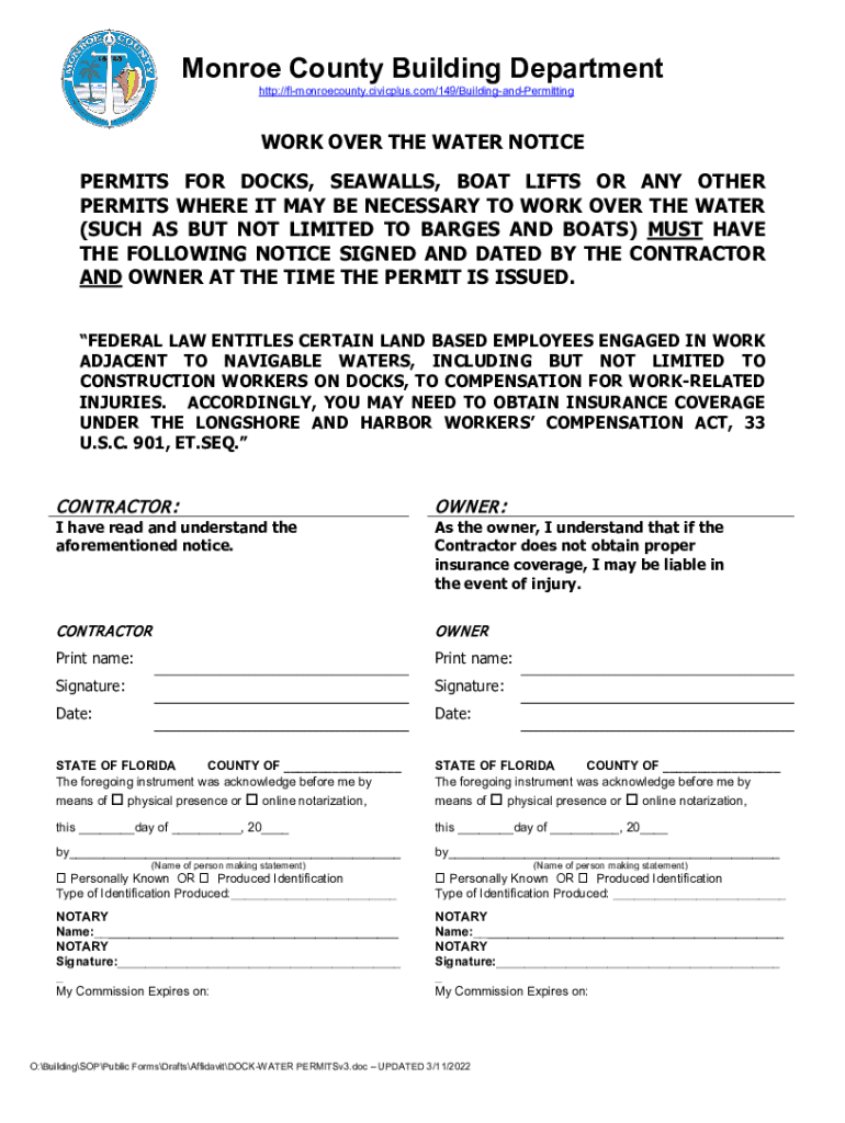 Monroe County Building Department http://flmonroecounty.civicplus.com/149/BuildingandPermittingWORK OVER THE WATER NOTICE PERMITS FOR DOCKS, SEAWALLS, BOAT LIFTS OR ANY OTHER PERMITS WHERE IT MAY