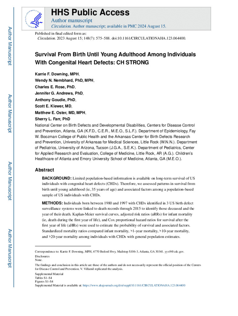 This study assesses the patterns of survival from birth until young adulthood for individuals with congenital heart defects (CHDs), focusing on data from a population-based sample in the United States. It examines the long-term survival rates, associated risk factors, and disparities in survival among different demographic groups and CHD severities. The study\'s findings reveal that 81.4% of individuals with CHDs born between 1980 and 1997 survived to age 35, highlighting significant...
