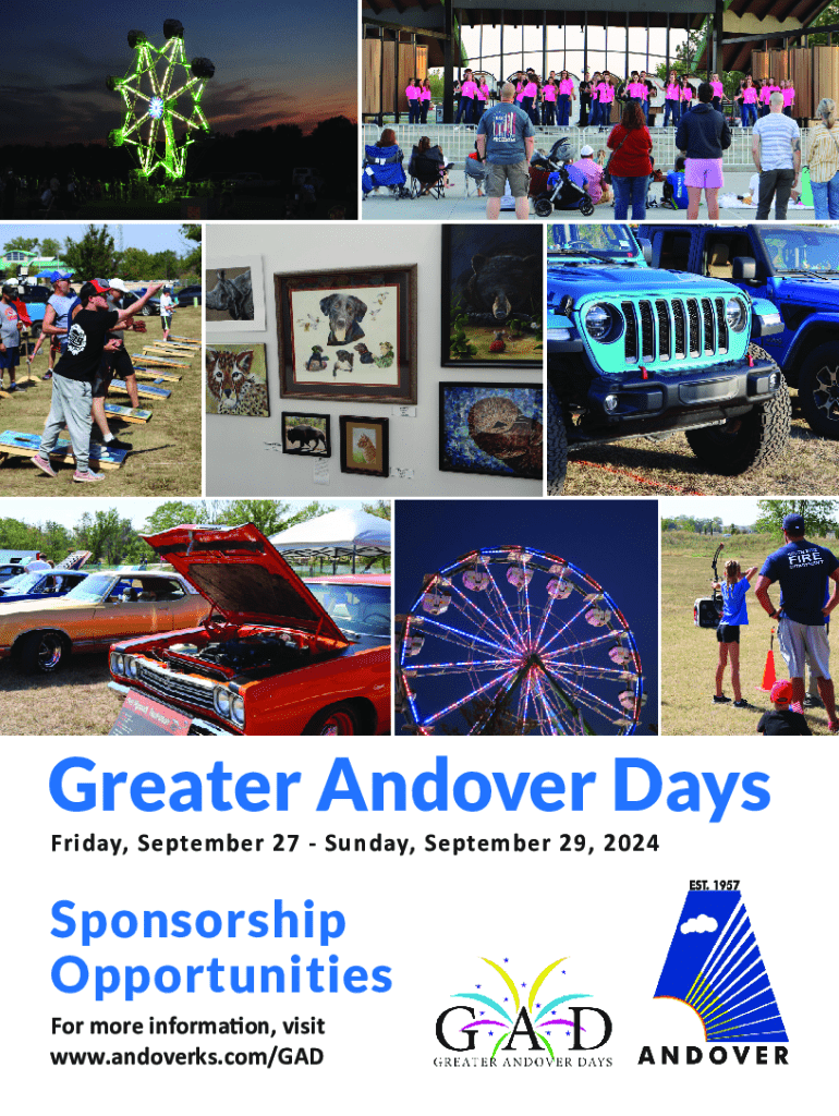Greater Andover Days Friday, September 27 Sunday, September 29, 2024Sponsorship Opportunities For more information, visit www.andoverks.com/GADGreater Andover DaysDate: Friday, September 27, Saturday,