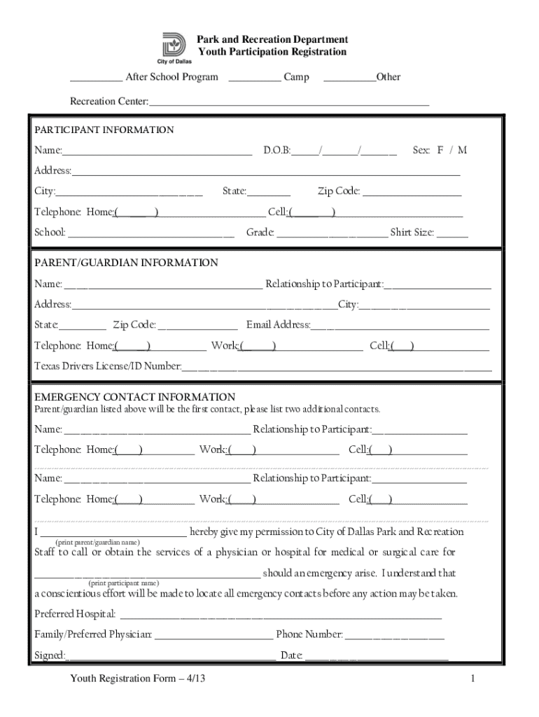 Park and Recreation Department Youth Participation Registration ___ After School Program ___ Camp___OtherRecreation Center:___ PARTICIPANT INFORMATIONName:___D.O.B:___/___/___Sex: F / MAddress:___