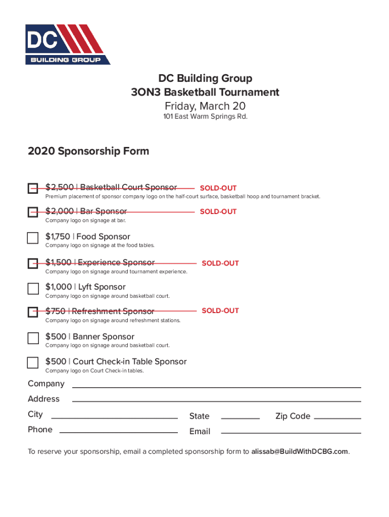 DC Building Group 3ON3 Basketball Tournament Friday, March 20 101 East Warm Springs Rd.2020 Sponsorship Form $2,500 | Basketball Court SponsorSOLDOUT$2,000 | Bar SponsorSOLDOUTPremium placement of