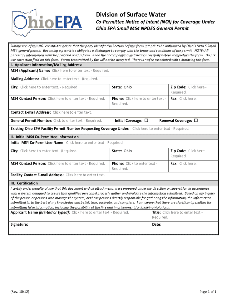 This document serves as a Notice of Intent for parties seeking authorization under Ohio\'s NPDES Small MS4 general permit. It requires submission of essential information related to the applicant and co-permittees, and it certifies compliance with the permit\'s terms and conditions.