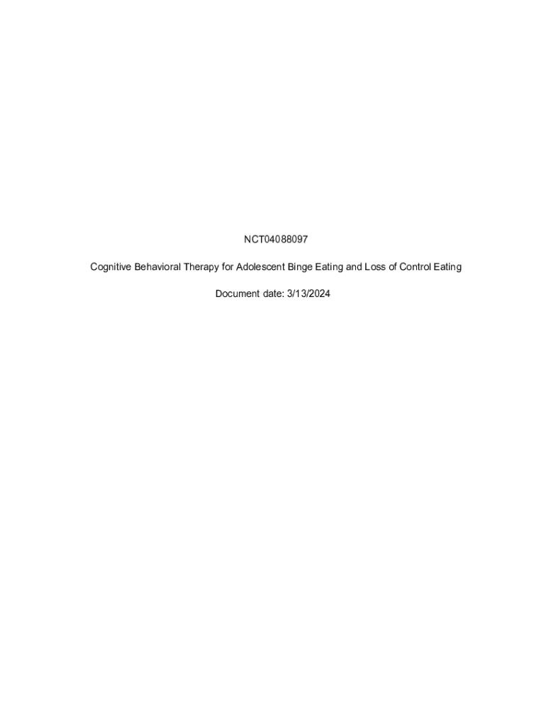 Filling out the NCT04088097 cognitive behavioral therapy form typically involves providing details such as the trial protocol, participant criteria, study procedures, and data collection methods as prescribed by regulatory guidelines.