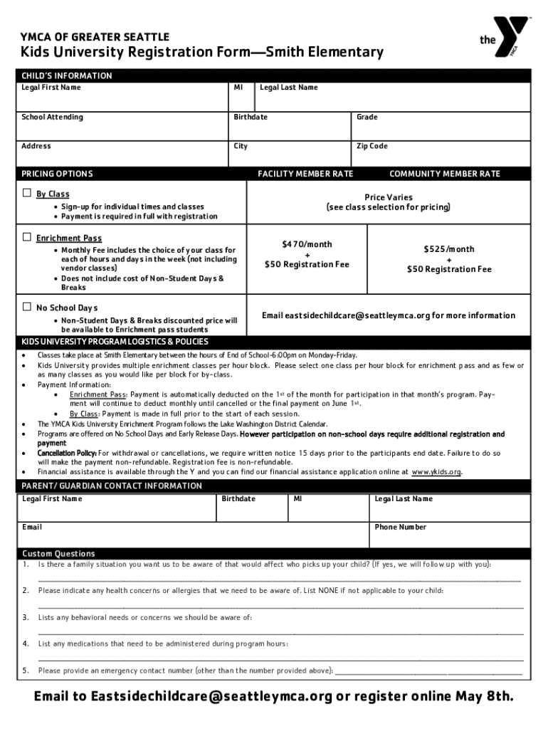 YMCA OF GREATER SEATTLEKids University Registration FormSmith Elementary CHILDS INFORMATION Legal First NameMISchool AttendingBirthdateGradeAddressCityZip CodePRICING OPTIONSLegal Last NameFACILITY