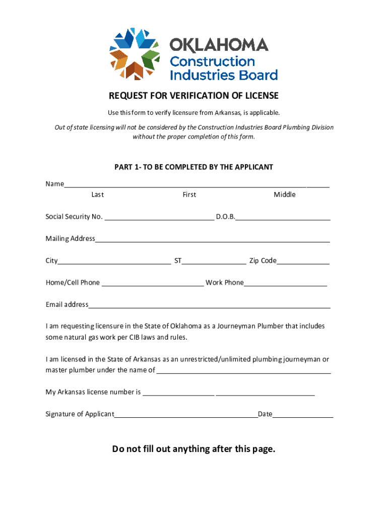 REQUEST FOR VERIFICATION OF LICENSE Use this form to verify licensure from Arkansas, is applicable. Out of state licensing will not be considered by the Construction Industries Board Plumbing Division