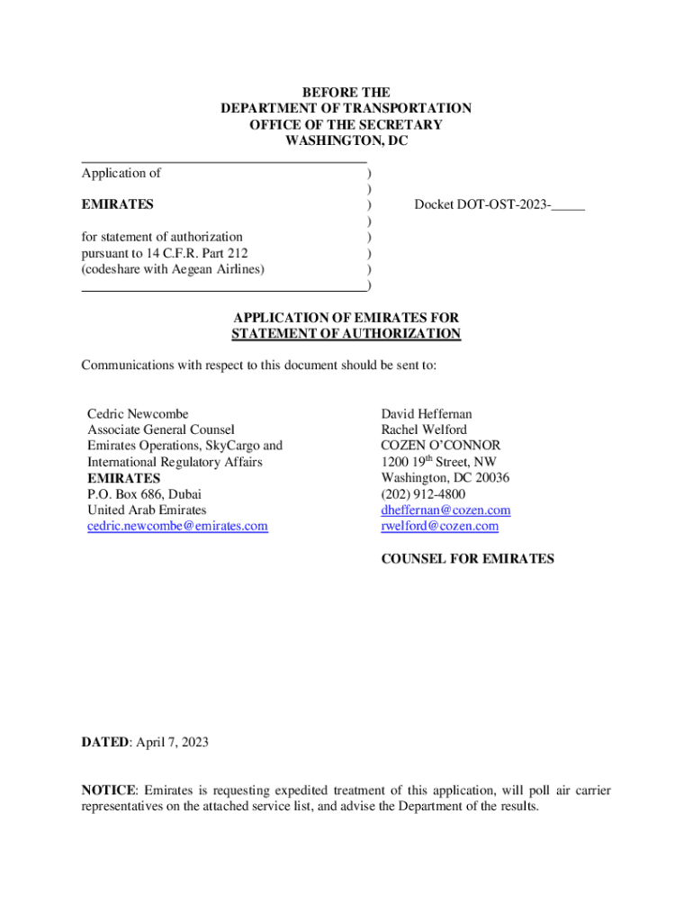 BEFORE THE DEPARTMENT OF TRANSPORTATION OFFICE OF THE SECRETARY WASHINGTON, DC Application of EMIRATES for statement of authorization pursuant to 14 C.F.R. Part 212 (codeshare with Aegean Airlines))