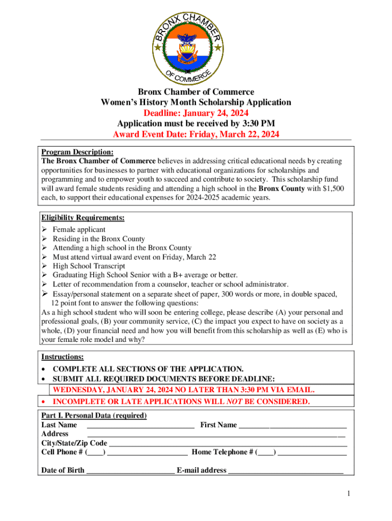 Get the free Bronx Chamber of Commerce Women’s History Month Scholarship Application