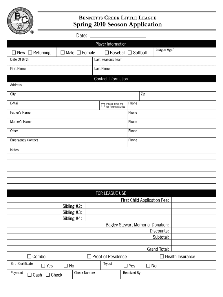 Clear Form Save Form Print Form BENNETT CREEK LITTLE LEAGUE Spring 2010 Season Application Date: Player Information New Returning Male Female Baseball Date Of Birth League Age* Last Season s Team