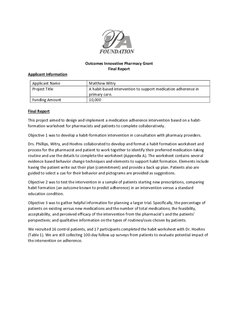 This report outlines a project aimed at designing and implementing a medication adherence intervention based on a habit-formation worksheet for pharmacists and patients. The report describes the objectives, methodologies, participant recruitment, preliminary findings, challenges, and future plans for broader trials. It includes qualitative and quantitative data on patient behavior and the effectiveness of using habit-based techniques to enhance medication adherence.