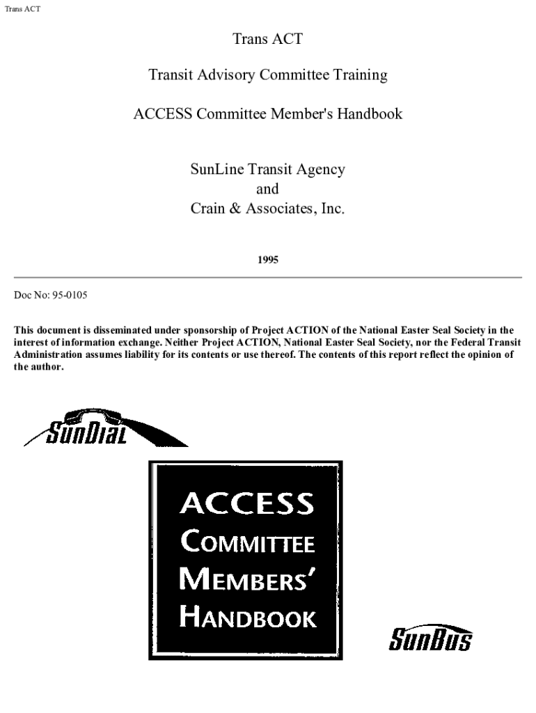 Trans ACTTrans ACT Transit Advisory Committee Training ACCESS Committee Member\'s Handbook SunLine Transit Agency and Crain & Associates, Inc. 1995 Doc No: 950105 This document is disseminated under