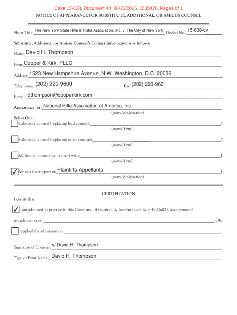 Case 15638, Document 44, 06/23/2015, 1538476, Page1 of 1 NOTICE OF APPEARANCE FOR SUBSTITUTE, ADDITIONAL, OR AMICUS COUNSELShort Title:The New York State Rifle & Pistol Association, Inc. v. The City